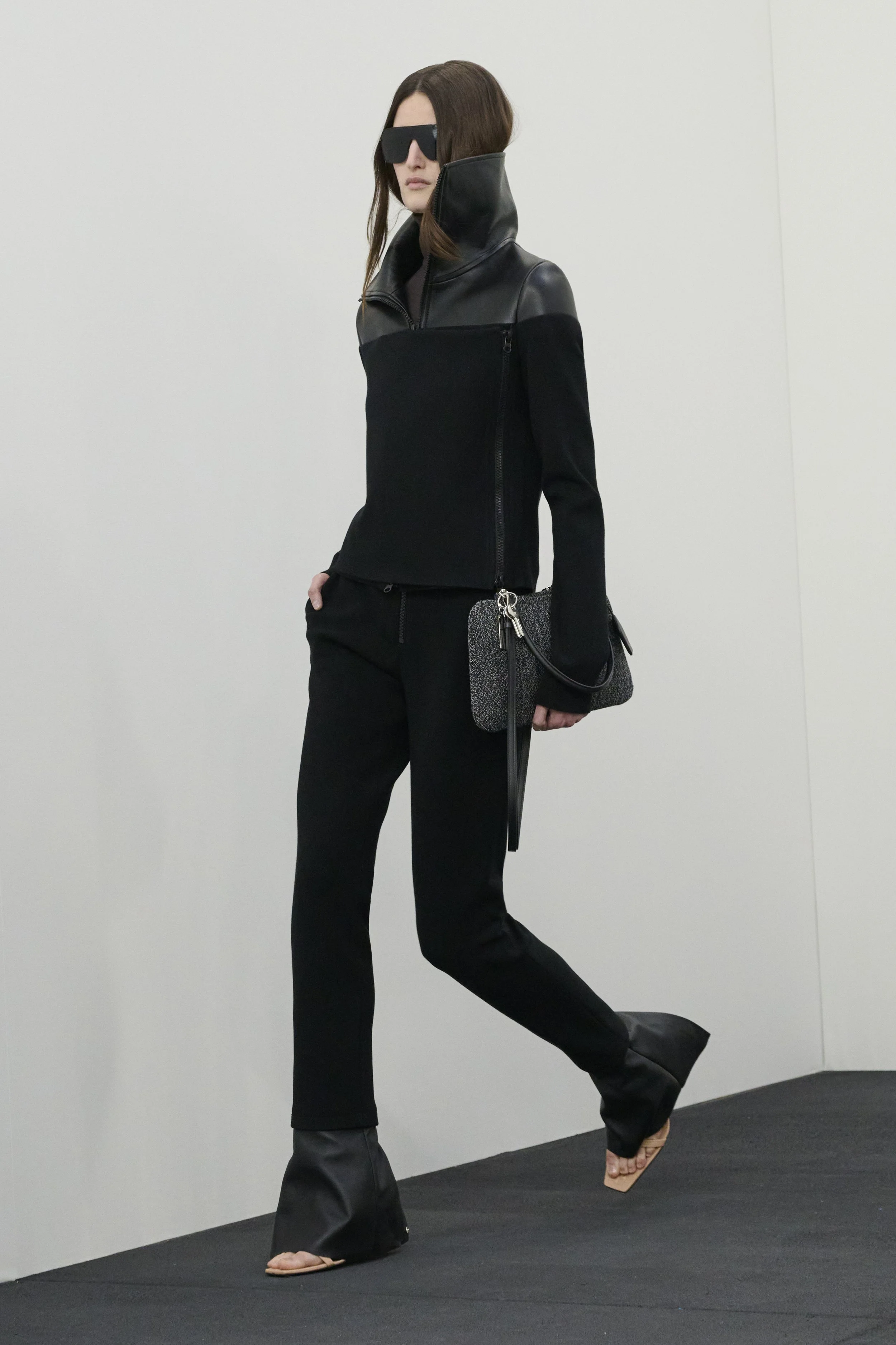 With a single gesture, a piece of fabric envelops the body, instantly forming a dress. The day begins in satin white, the body moving naturally and freely over the hybrid fabric. These pieces draw inspiration from the Maison's archives spanning the 1960s to the 1980s, eventually transitioning into the coats worn during the day. Tailoring details—multiple snap buttons, trapeze cuts, vinyl ensembles, injection zippers—draw from the Maison's codes.