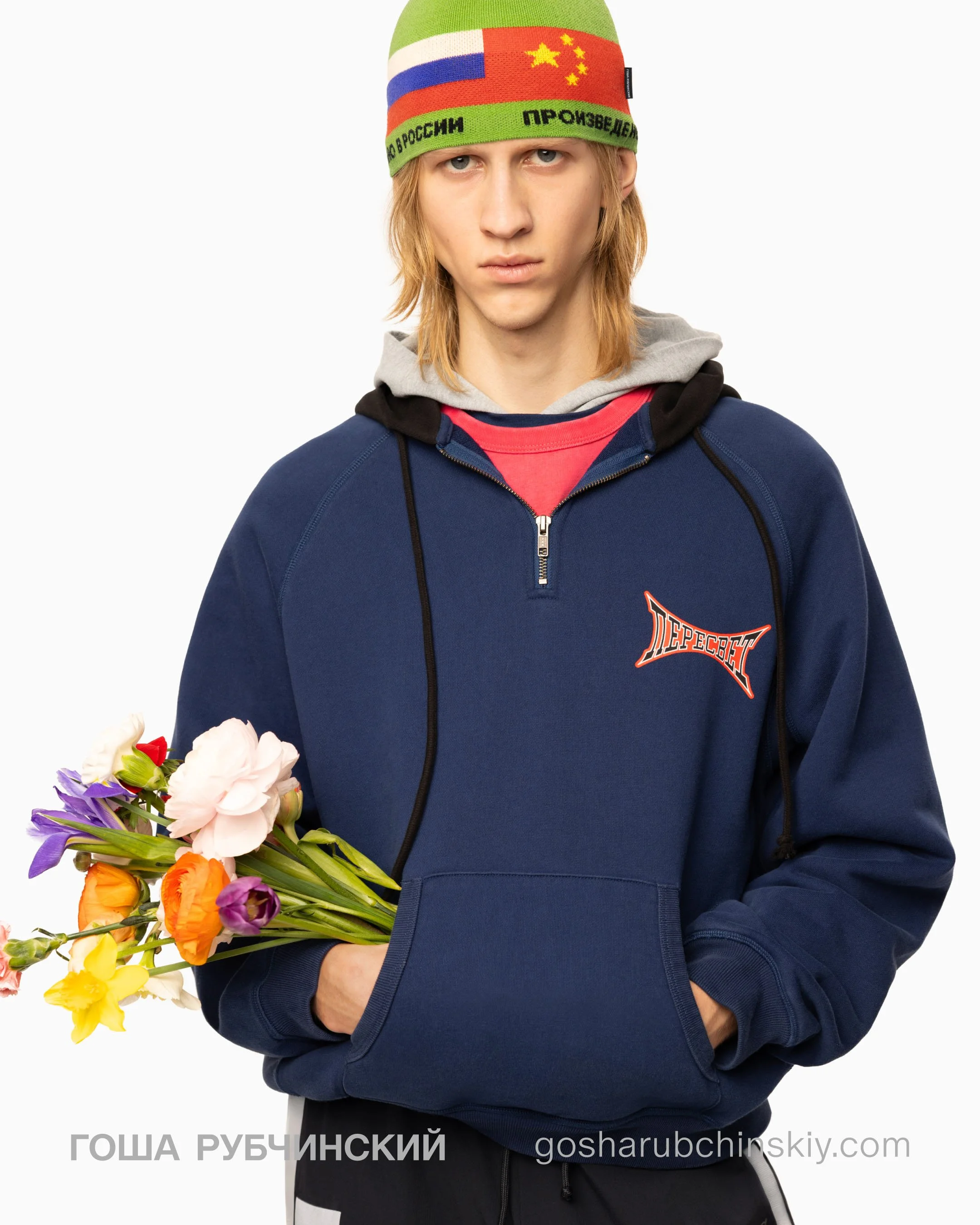 PERESVET is built around the essentials of a sports wardrobe, stripping each garment back to its most direct expression. Sweatshirts, fleece pullovers, knitwear, and outerwear are refined through clean construction, generous volume, and a considered sense of balance. Every element reduced to what matters — shape, function, attitude. Oversized silhouettes feel controlled rather than exaggerated; soft materials elevated through structure and proportion. The result is clothing that redefines the everyday through a precise visual language. The second work is a Cyrillic print reading DESIGNED IN RUSSIA / MADE IN CHINA, appearing across t-shirts, hoodies, sweatpants, hats, and scarves. The same text, repeated through each piece. The accompanying image series places attention on gesture, posture, and presence. A bouquet of flowers runs through both — a quiet counterpoint to the severity of each: softness meeting discipline, intimacy meeting uniform.