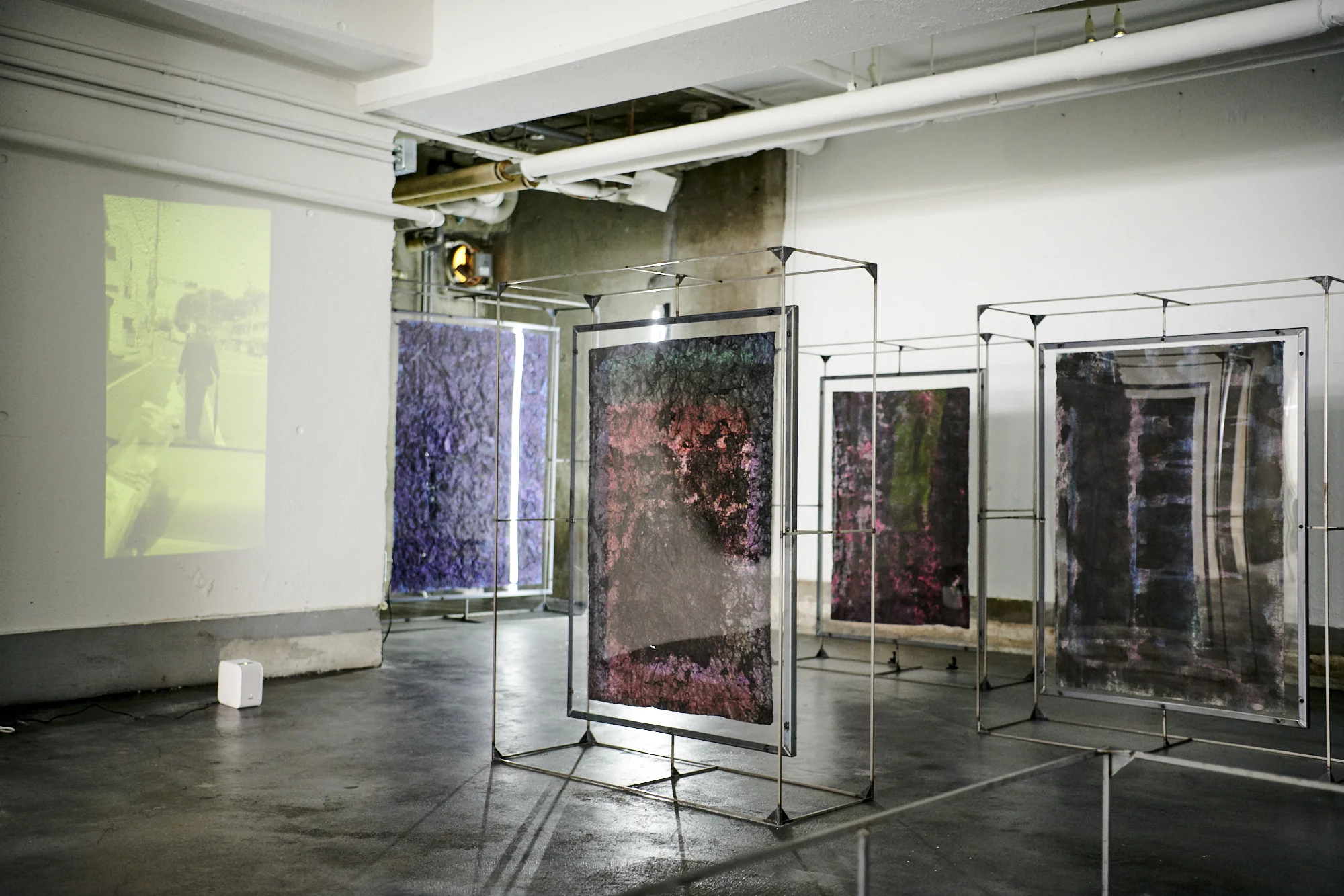 The theme and title of this exhibition Zokuzokusuru Washi (Thrilling Washi), is intended to release the soft general image of washi, such as silence, relaxation, and calmness. The steel exhibition frames jointly produced with uiw not only provoke rare unwavering harmony of iron and Japanese paper, but they are carefully designed in consideration of light insertion, in order to effectively sense the transmitted light of the rattan fibre.