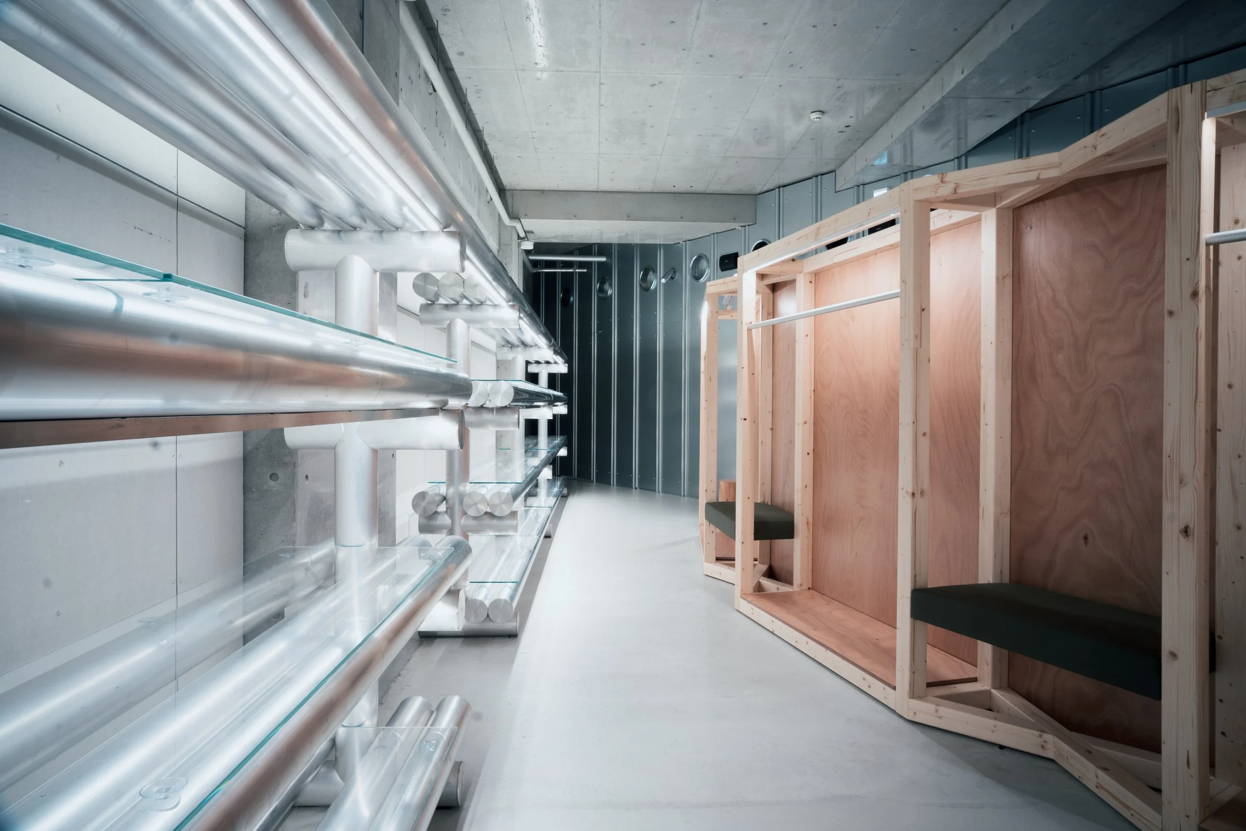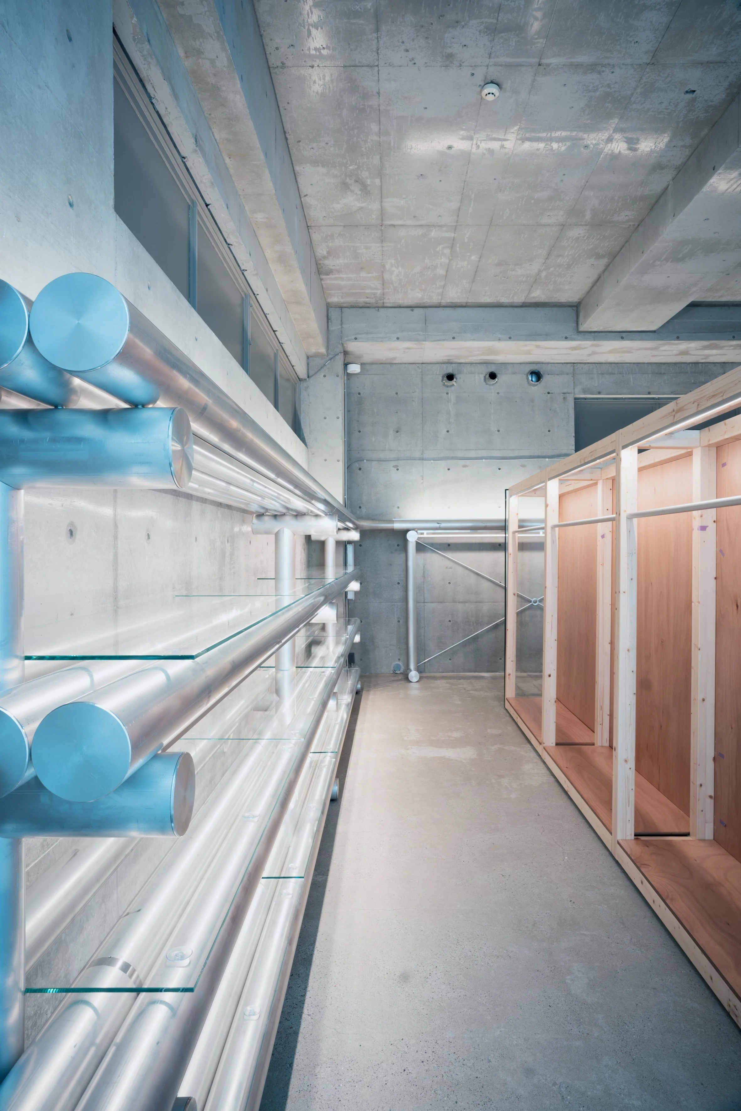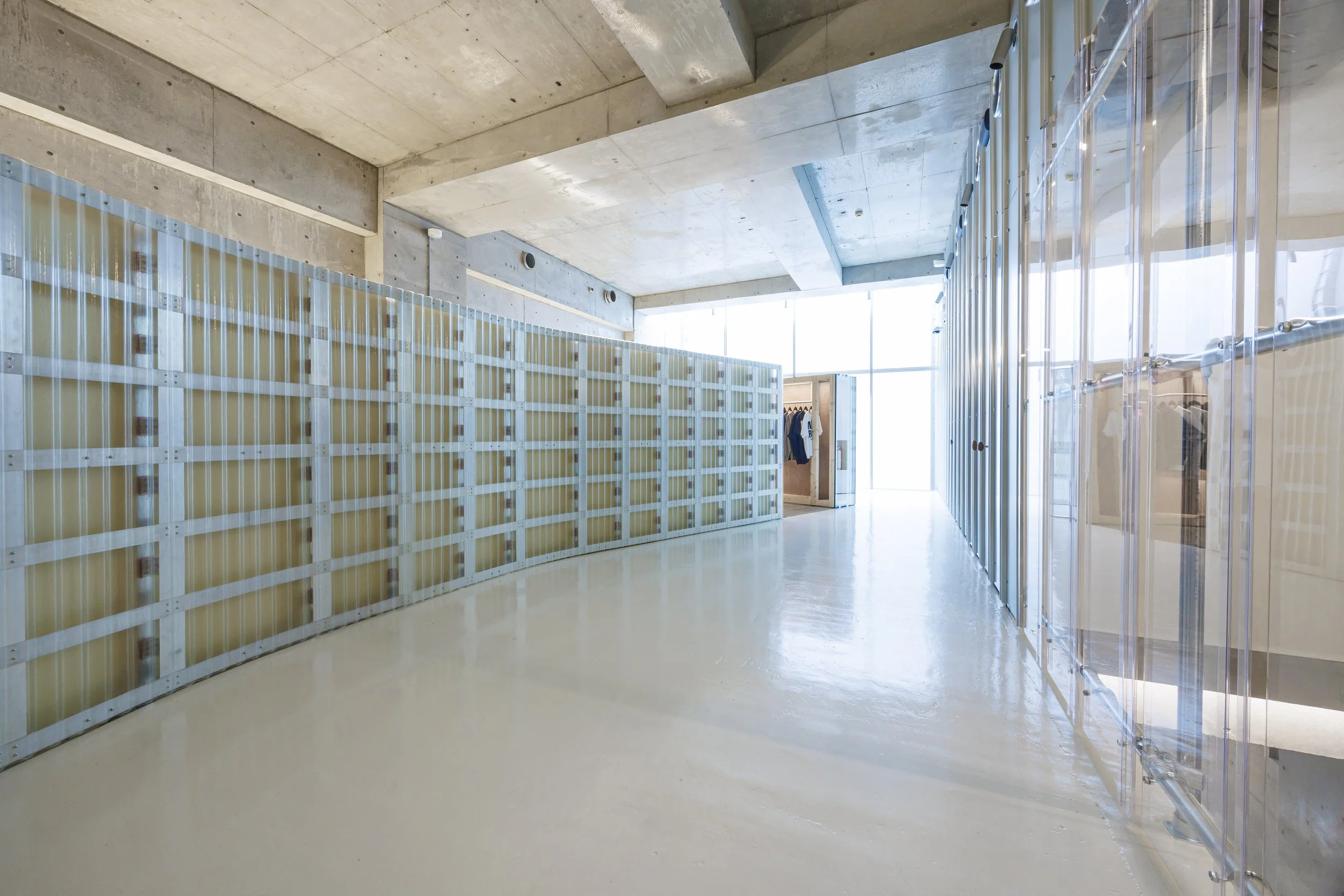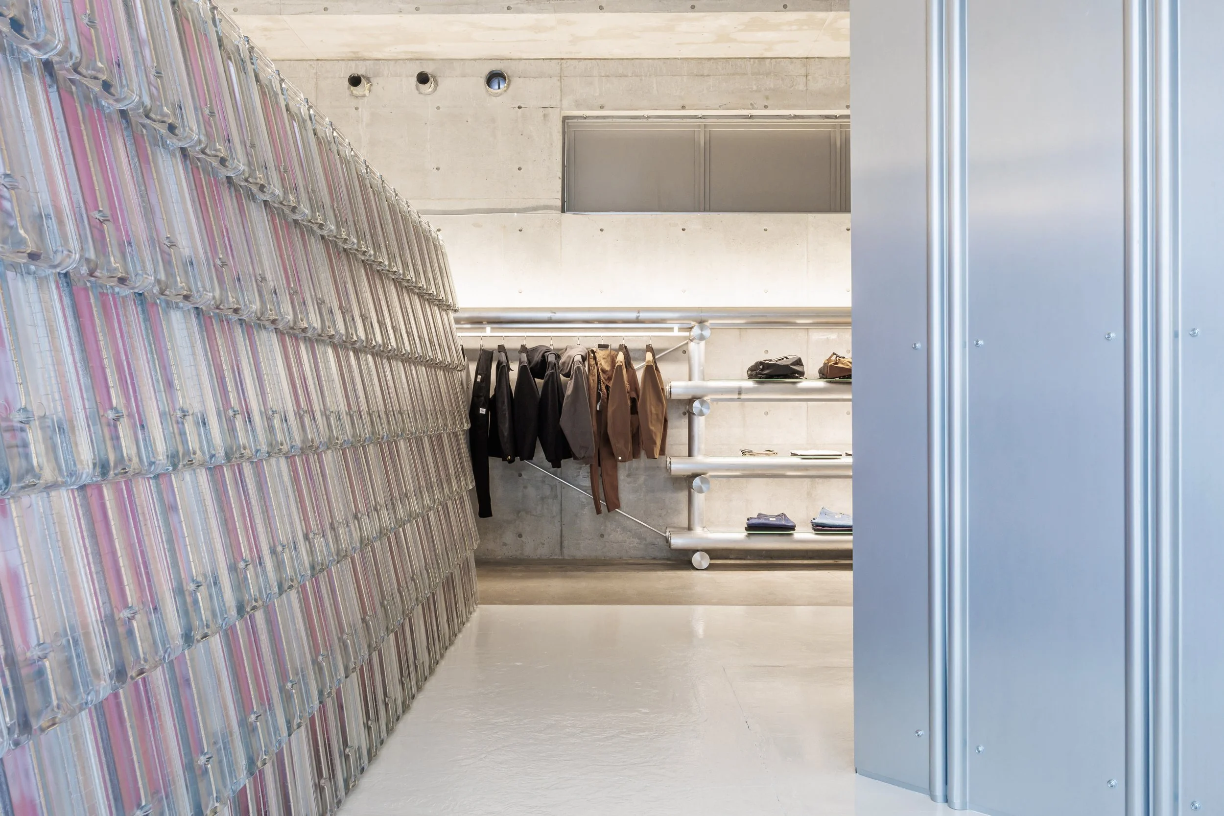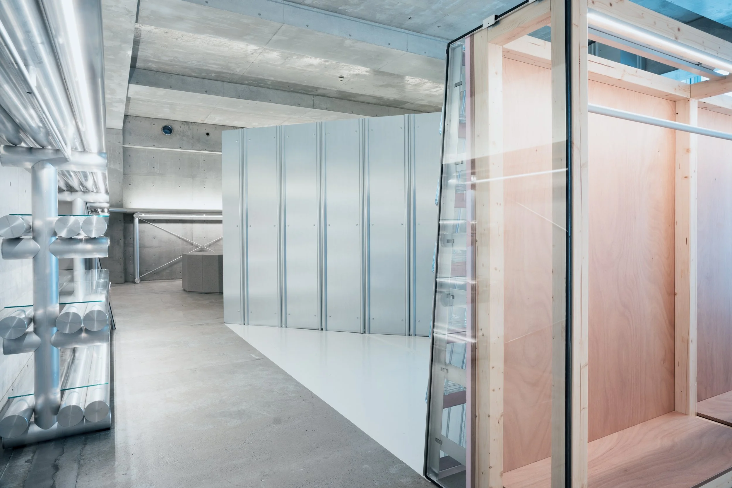 In this sense, the interior project extends and radicalises the architectural idea of temporality and neutrality developed on the façade. The building becomes a layered field in which commerce, research, exhibition, and infrastructure coexist without rigid hierarchies, proposing a new model for multibrand environments in which cultural production and retail experience are no longer treated as separate domains but as mutually generative conditions within the contemporary city.