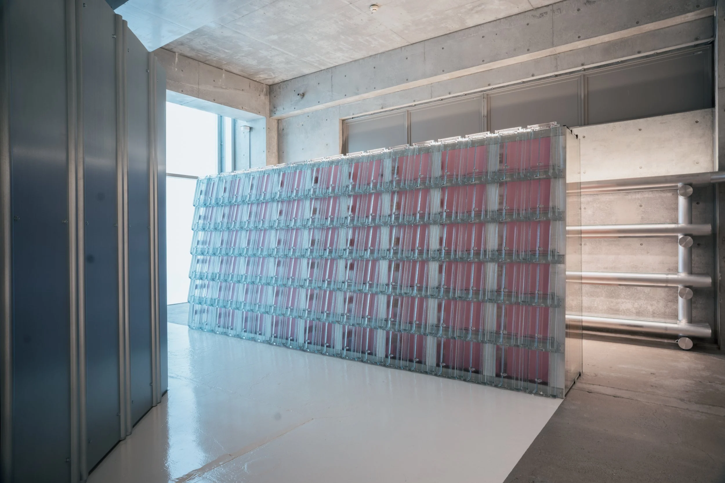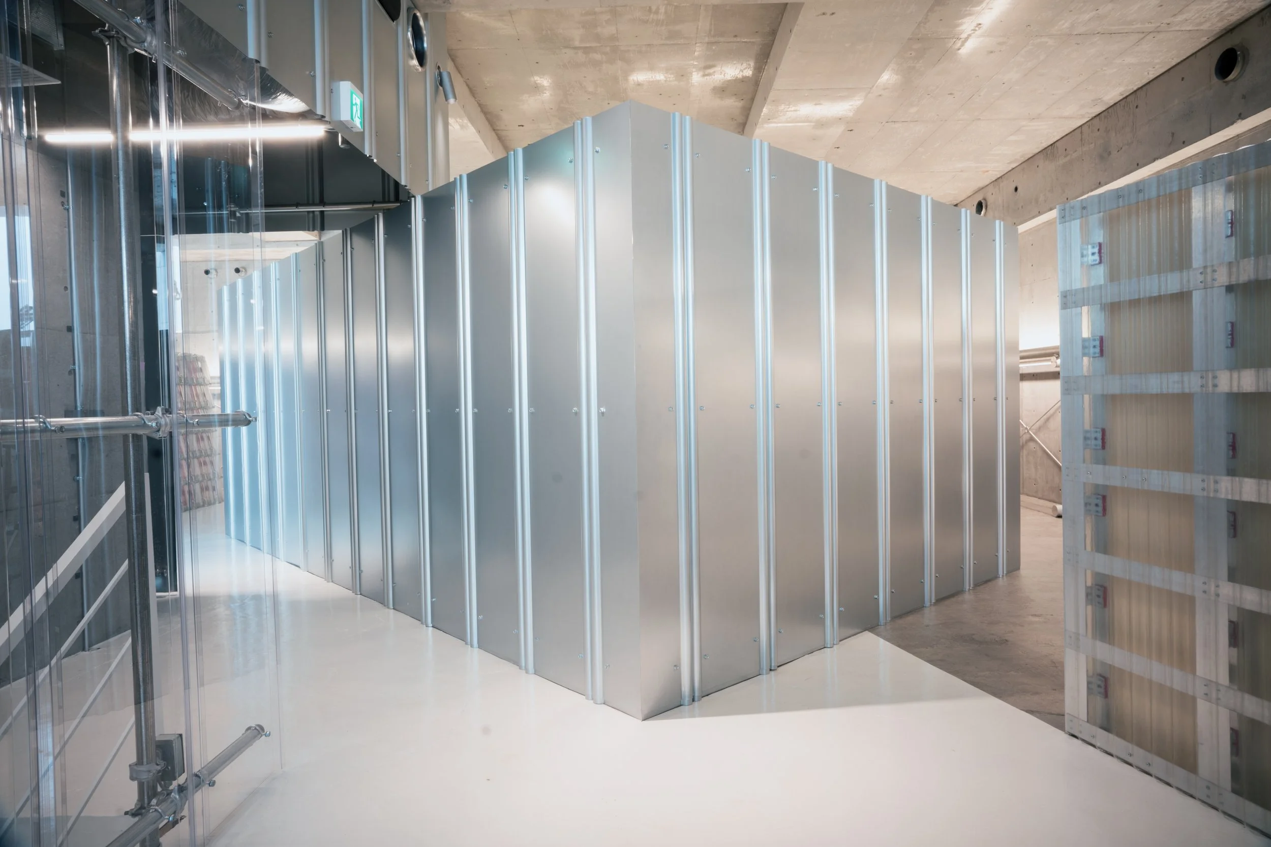 The exhibition spaces are conceived at a heightened level of abstraction. Their floors are finished in a white, glossy surface capable of accommodating a wide range of installations and temporary interventions. These neutral platforms are framed by a sequence of architectural backdrops ̶theatrical wings that emerge from Andrea Caputo Studio’s long-standing research into construction systems. In particular, these elements are imagined as literal dissections of ventilated façades: fragments presented at different stages of assembly which, in revealing their constructive logic, become an ideal scenographic background for artistic insertions and experimental displays.