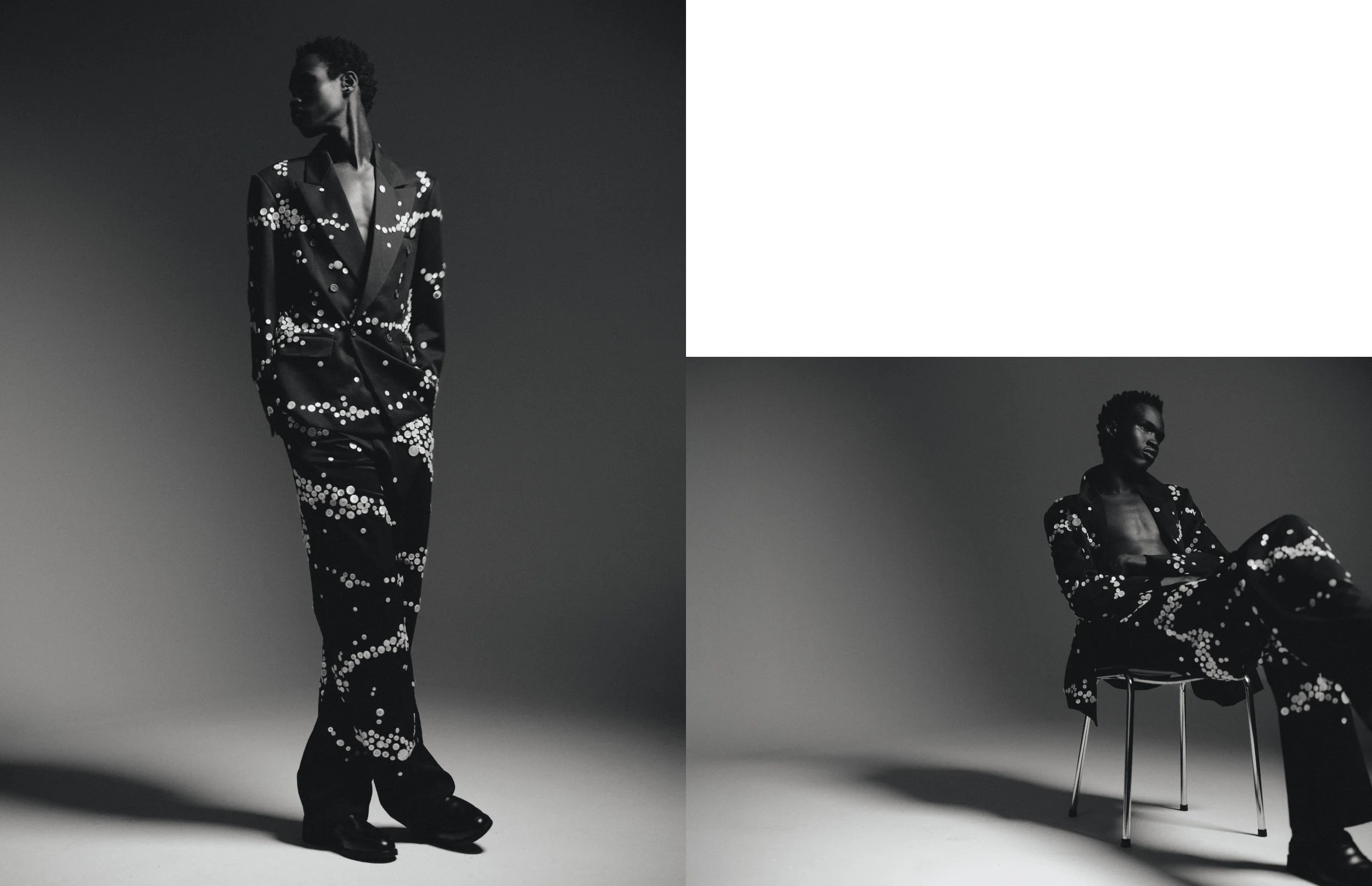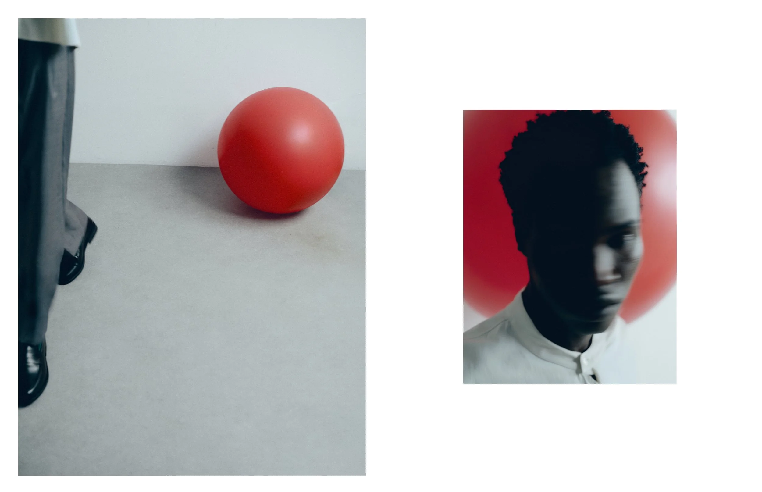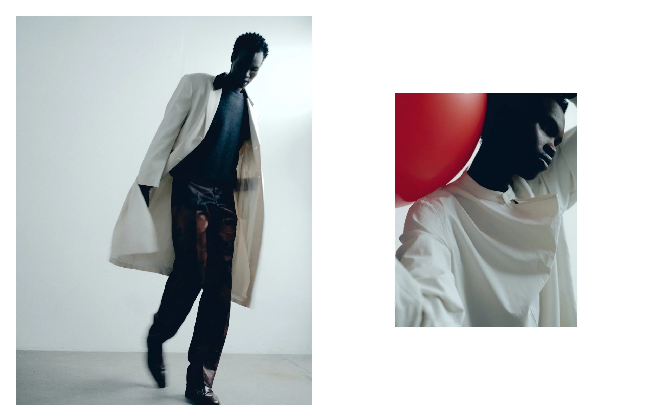 Left: Coat_Denzil Patrick, Jumper_ Margaret Howell, Trousers_ Denzil Patrick, Shoes_ Mithridate
