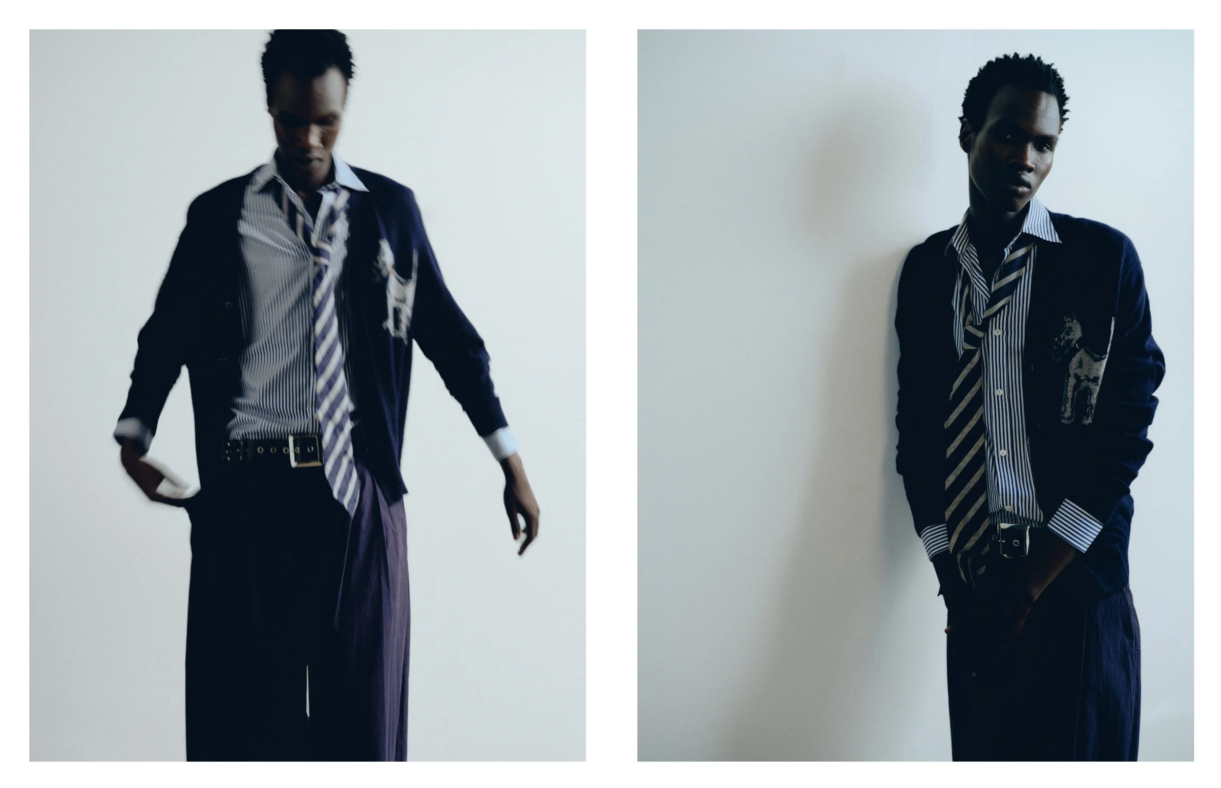 Shirt, Cardigan & Tie_ Dunhill, Trousers_ Studio Nicholson, Belt_ London Leatherman